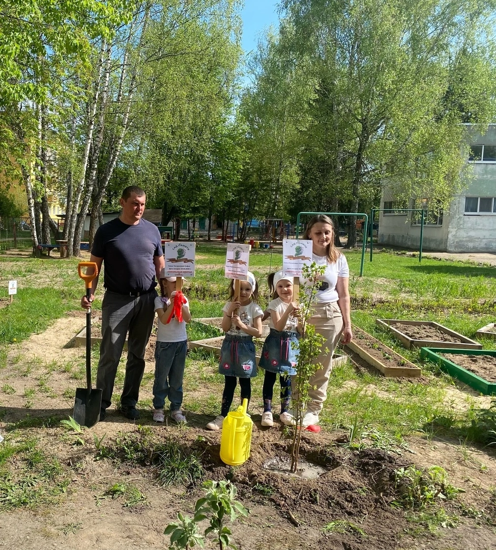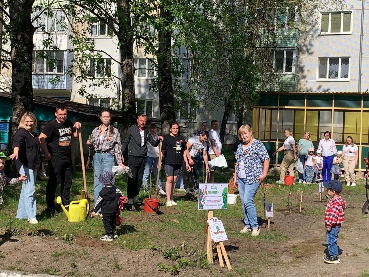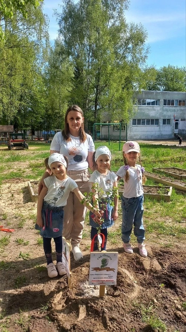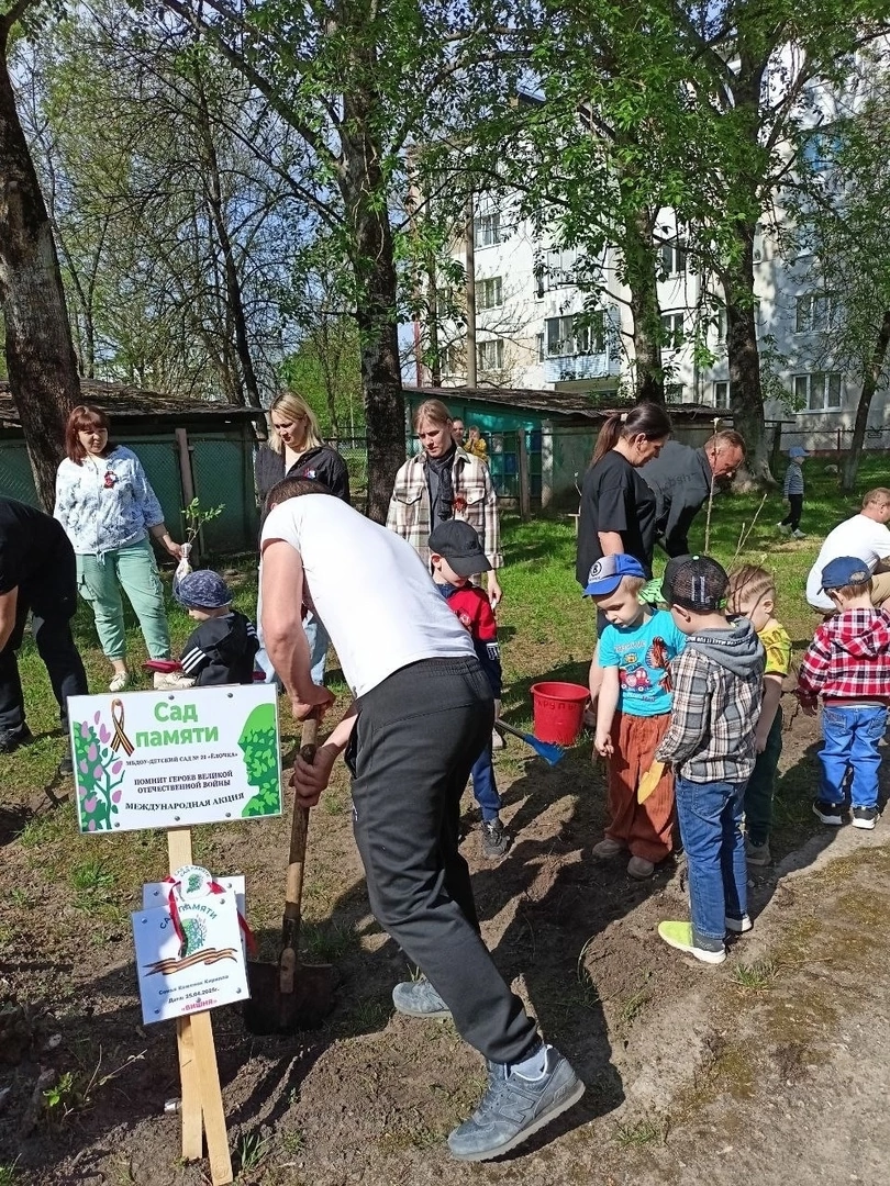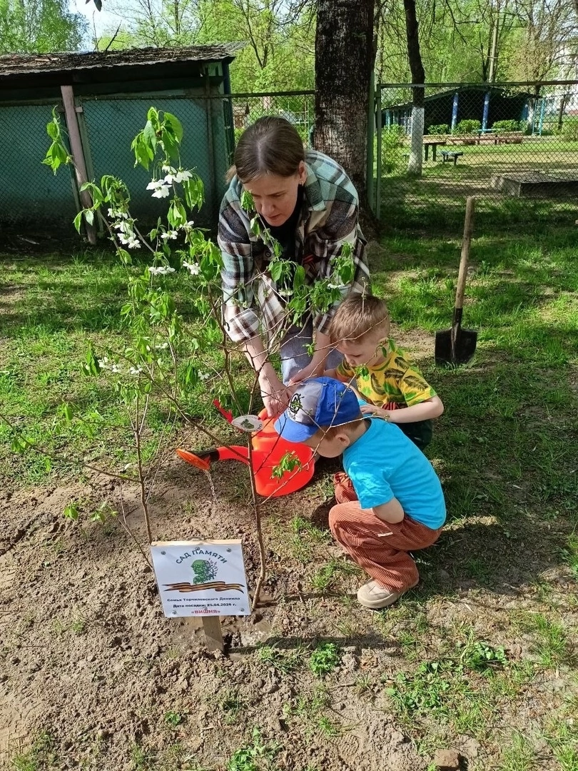 Дети, родители и сотрудники детского сада приняли участие в Международной акции "Сад Памяти". Целью акции является высадка 27 миллионов деревьев в память о каждом погибшем в Великой Отечественной войне.